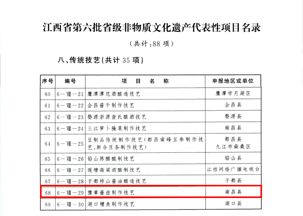近日,江西省人民政府公布江西省第六批省級(jí)非物質(zhì)文化遺產(chǎn)代表性項(xiàng)目名錄,煌上煌傳承保護(hù)的“豫章醬鹵制作技藝”成功入選。這一殊榮不僅是...