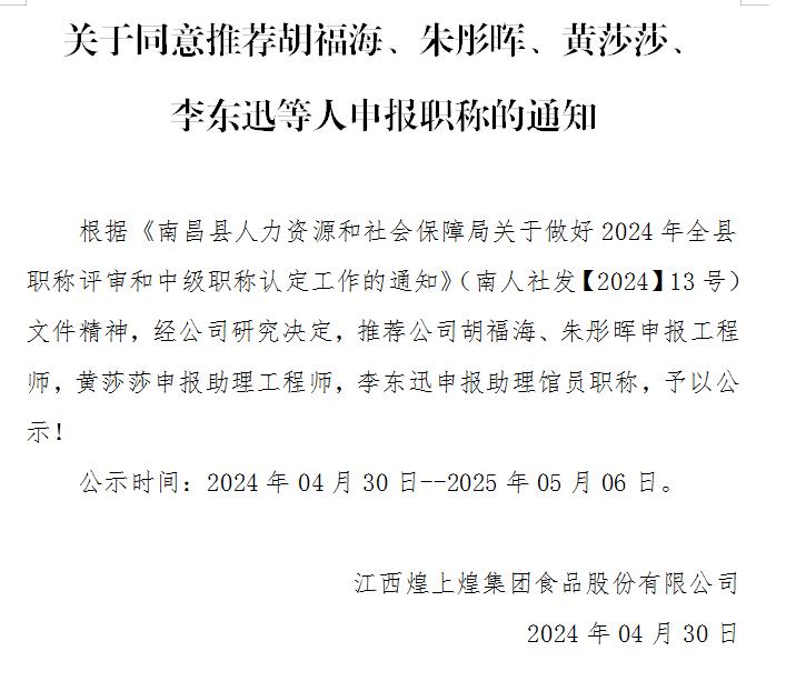 根據(jù)《南昌縣人力資源和社會(huì)保障局關(guān)于做好2024年全縣職稱(chēng)評(píng)審和中級(jí)職稱(chēng)認(rèn)定工作的通知》(南人社發(fā)【2024】13號(hào))文件精神,經(jīng)公司研究決...