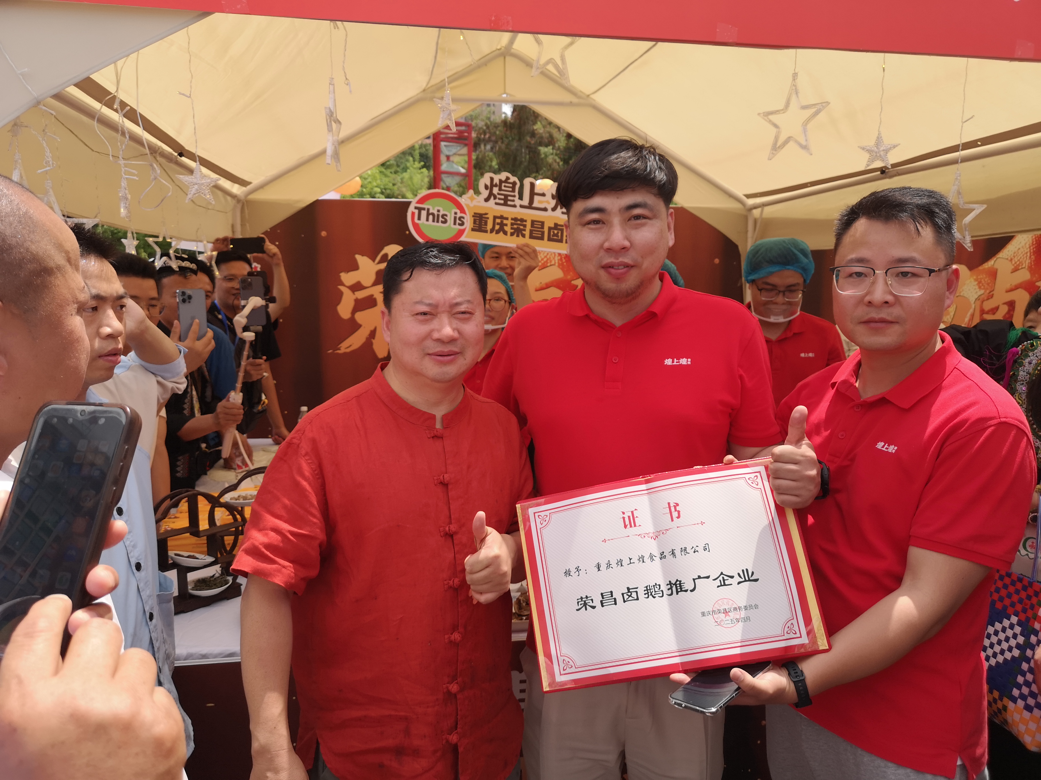 4月30日,千年榮昌·2025年榮昌鹵鵝非遺美食消費(fèi)季系列活動在重慶榮昌區(qū)人民廣場開幕。煌上煌憑借強(qiáng)大的銷售網(wǎng)絡(luò)、完備的生產(chǎn)線以及推廣鹵鵝產(chǎn)業(yè)發(fā)展的使命感,被榮昌政府授予“榮昌鹵鵝推廣企業(yè)”榮譽(yù)。