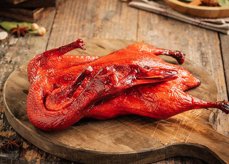 產品介紹:精選1000克左右的鮮凍白條鴨,摘凈殘毛和內腔異物,采用多種調味料和香料腌漬調理,產品經烘烤、醬制而成。產品色澤金黃,皮脆肉酥,富有濃郁的臘香風味。因其形狀相似琵琶,醬制而成,故取名琵琶醬鴨,是煌上煌醬鴨品系的另一種特色產品。